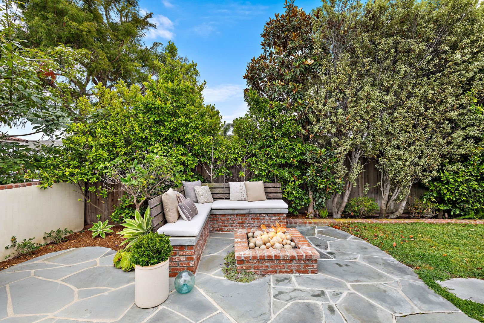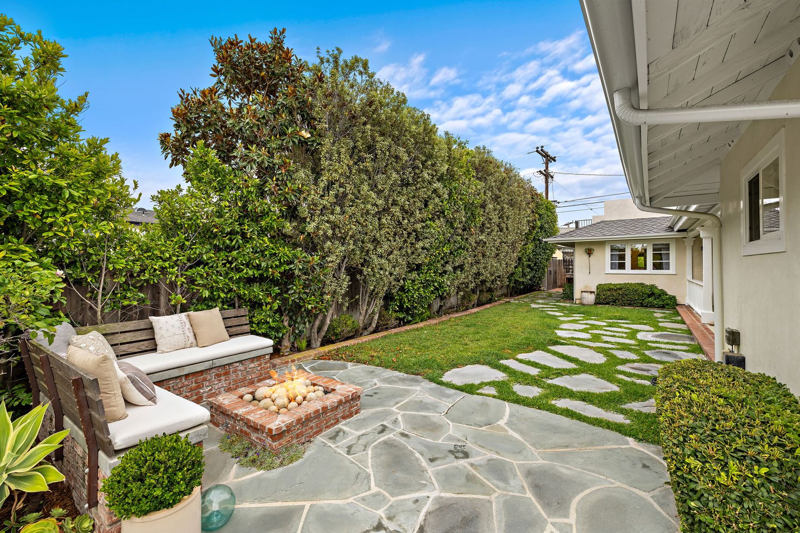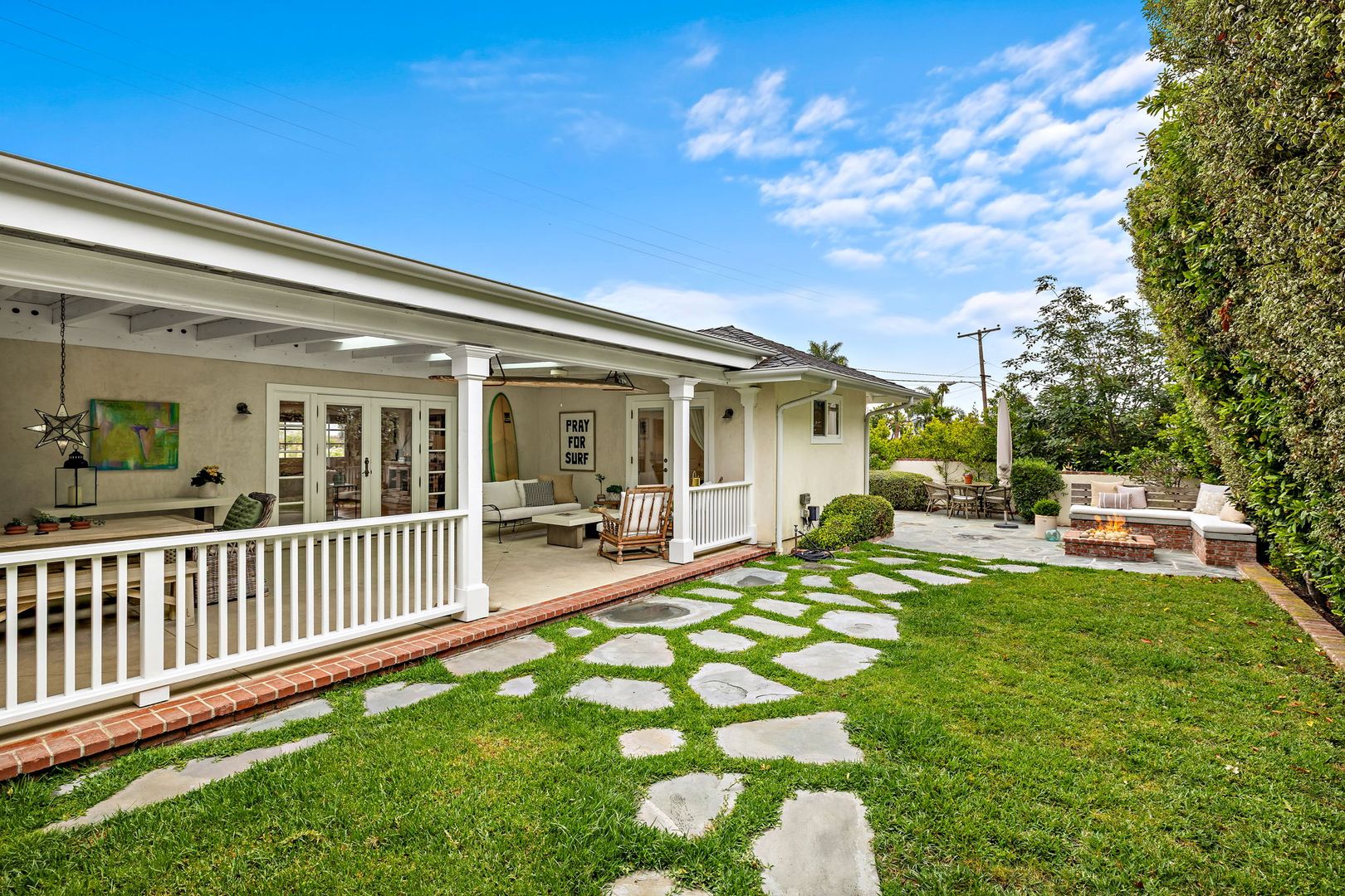 with a covered California room, grassy lawn, fire pit seating area, patio,