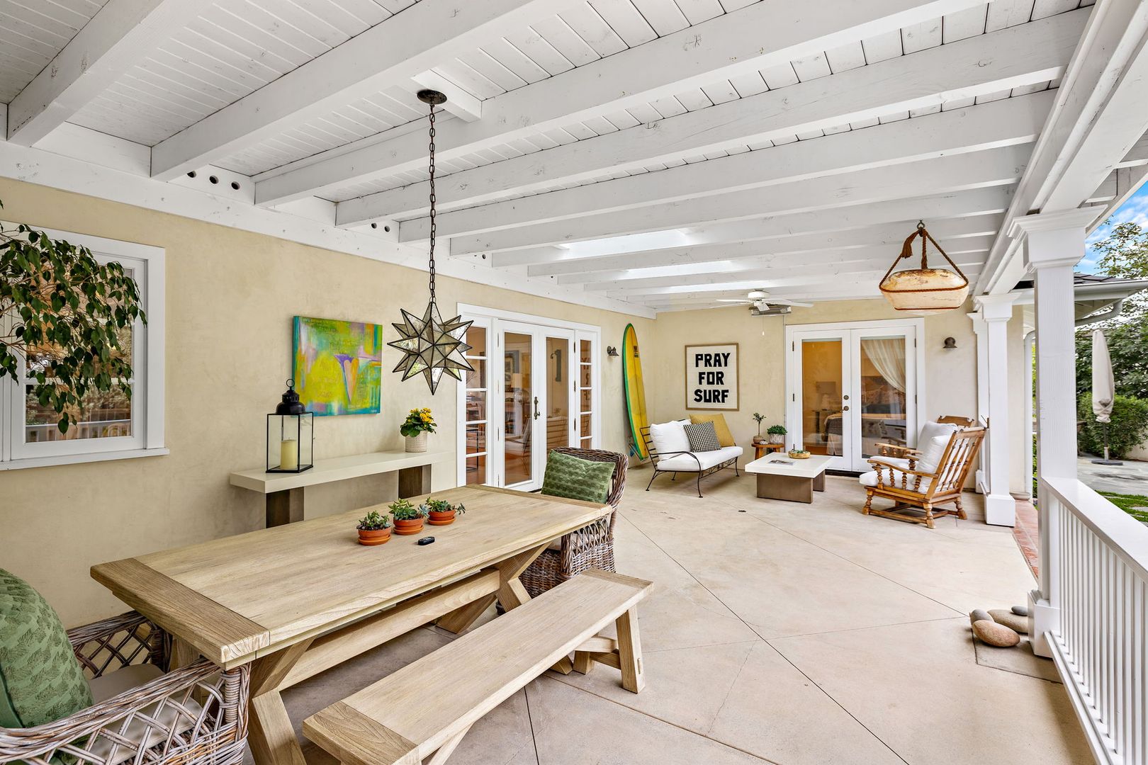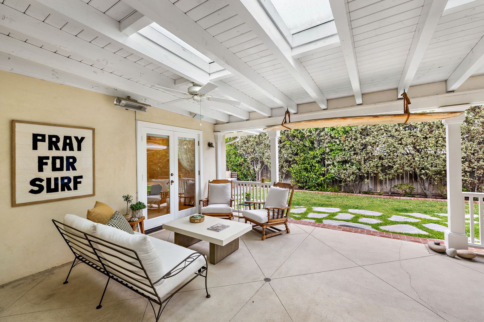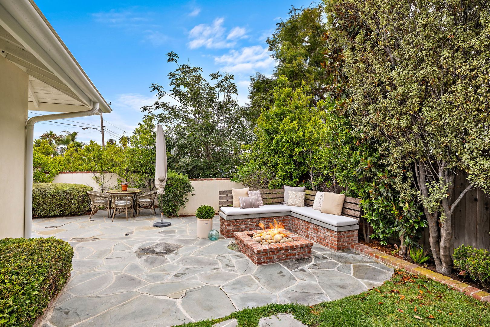 with a covered California room, grassy lawn, fire pit seating area, patio,
