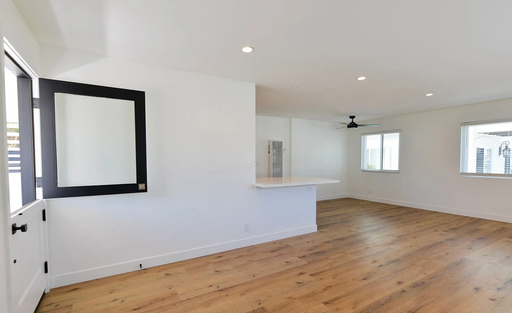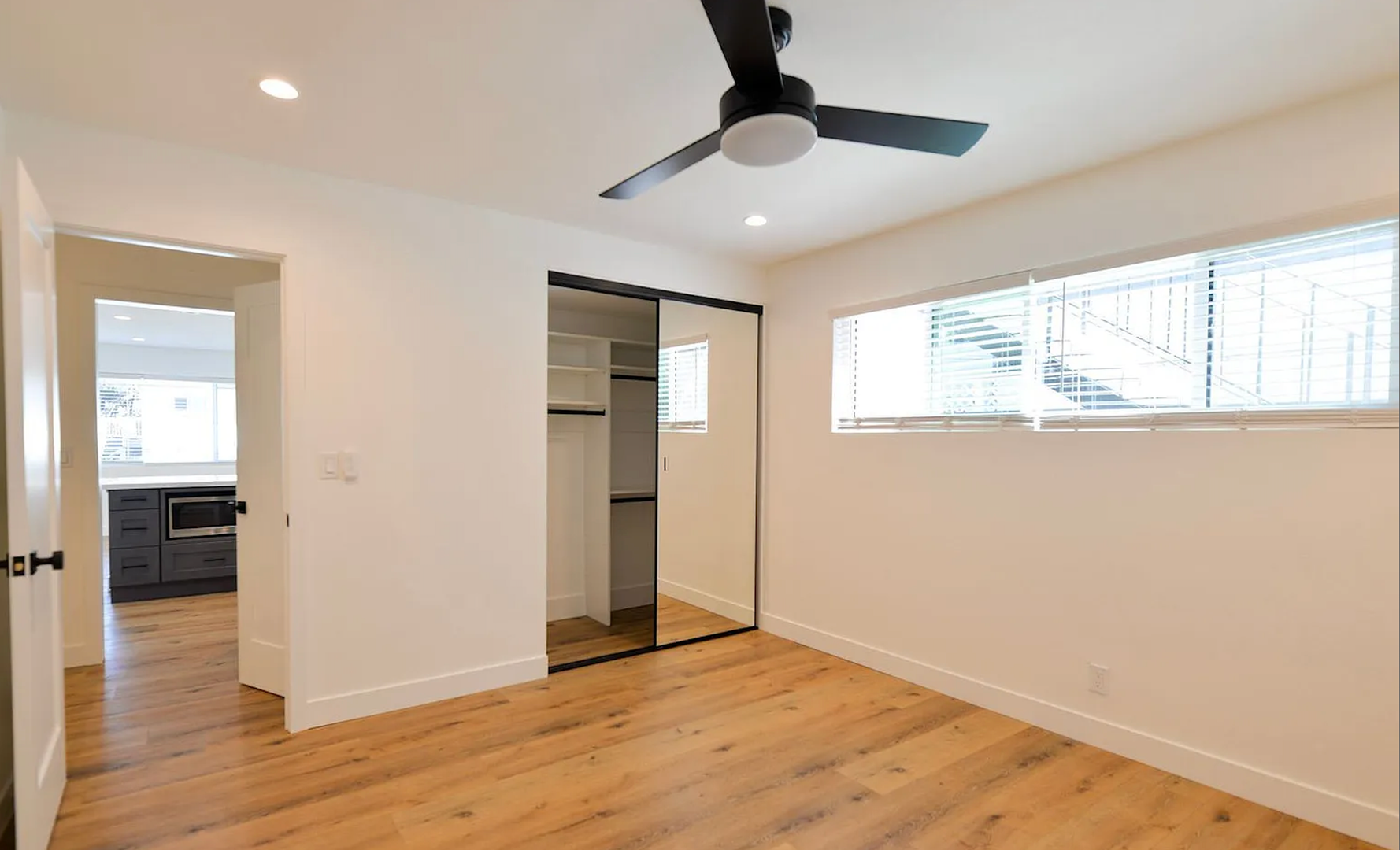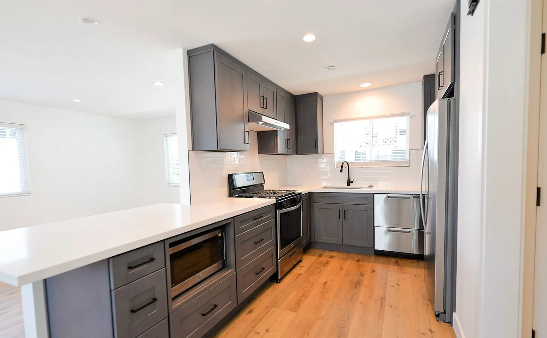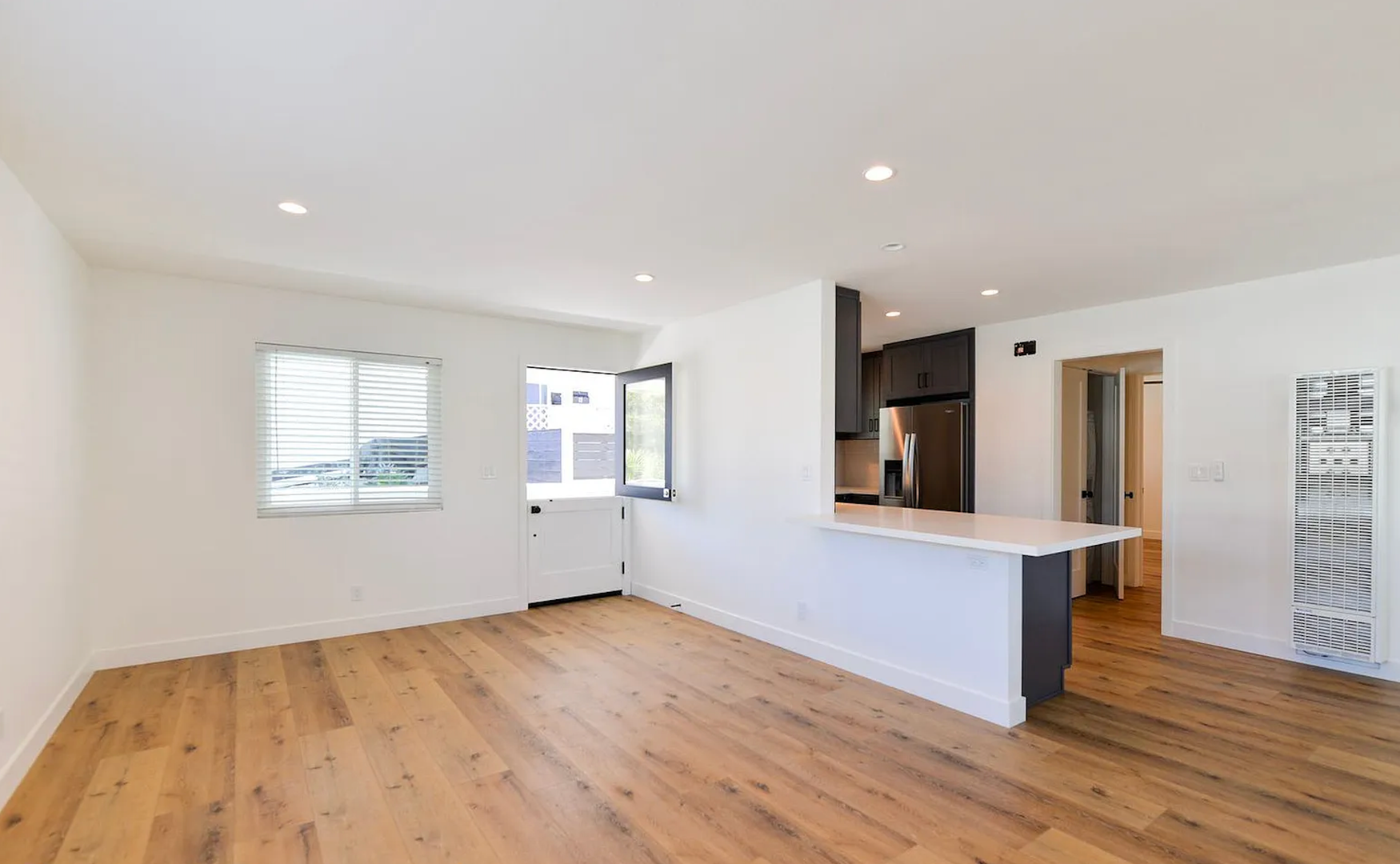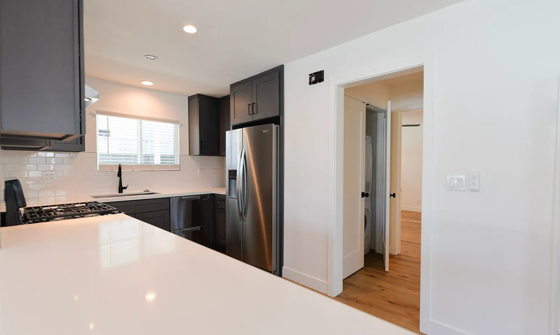 This stylish two bedroom sits at the front of a fully remodeled tri-plex, just a 5-minute walk to the San Clemente Beach Trail. Inside, the open layout features a Dutch front door, shaker cabinets, quartz counters, subway tile backsplash, and a breakfast bar. The kitchen comes fully equipped with all major appliances plus a stacked washer and dryer for easy move-in. The bathroom includes a full tub, glass shower doors, and a long vanity with great storage. You'll also enjoy double-pane windows, vinyl flooring throughout, black hardware, mirrored closet doors, and multiple ceiling fans. Parking includes a one-car garage with an automatic door and an additional driveway space.